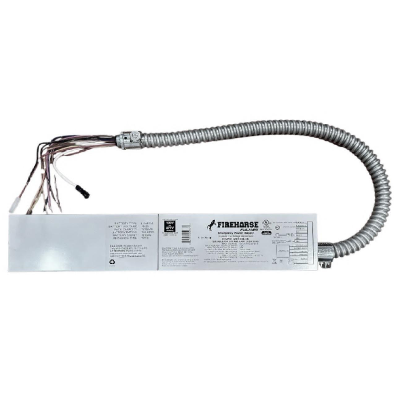 Fuente de alimentación de emergencia, entrada universal 120-277 V, salida 50 W máx., funcionamiento automático en modo de emergencia (90 minutos), compatible con cualquier tecnología de iluminación LED, eficiencia >90%, protecciones integradas, vida útil 50,000 horas, certificaciones: UL924, cULus, NOM, FCC.