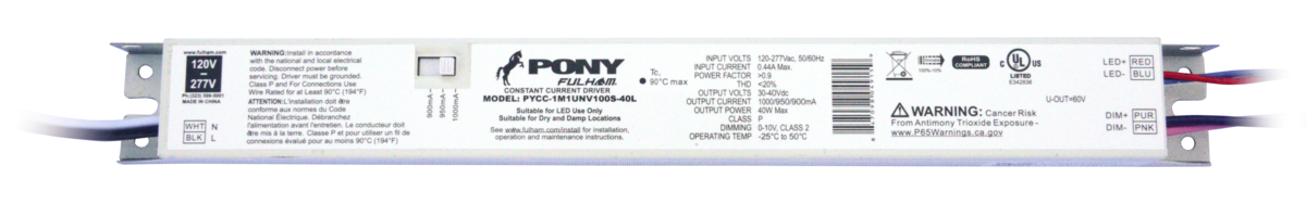 Driver LED programable Fulham PYCC-1M1UNV100S-40L, de corriente constante 120-277 V, salida 30-40 VCD, corriente programable 900 mA – 1000 mA, atenuación 0-10 V (1-100%), eficiencia >90%, protección 2.5 kV, vida útil 50,000 horas, certificaciones: cULus, NOM, FCC.