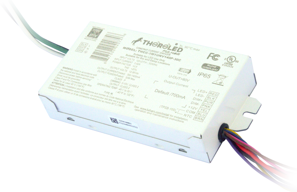 Driver LED programable, de corriente constante 120-277 V, salida 12-56 VCD, corriente programable 350 mA – 1400 mA, atenuación 0-10 V (1-100%), eficiencia >90%, protección 2.5 kV, vida útil 50,000 horas, certificaciones: cULus, NOM, FCC.